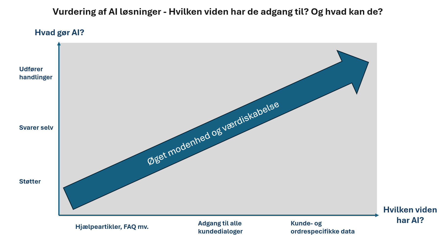 Det handler ikke kun om, hvad AI isoleret set kan, men også om, at den skal indgå i en samlet løsning. Hvis eksempelvis AI skal foreslå svar til kunder i en kundeserviceløsning, skal AI være en del af denne løsning eller kunne integreres i den. Det kan også være, at den skal skaffe adgang til ordredata mv.